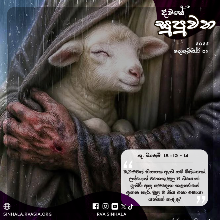 12 ”ඔබ කුමක් සිතන්නහු ද? බැටළුවන් සියයක් ඇති යම් මිනිසෙක්, උන්ගෙන් එකෙකු මුළා ව ගියොත්, ඉතිරි අනූ නවදෙනා කඳුකරයේ ඉන්න හැර, මුළා ව ගිය එකා සොයා යන්නේ නැද් ද? 13 සැබැවින් ම ඔබට කියමි, ඌ සම්බ වුනොත් මුළා ව නොගිය අනූනව දෙනා ගැන ප්රීති වෙනවාට වඩා ඌ ගැන ප්රීති වන්නේ ය. 14 එසේ ම මේ බාලයන් එක් කෙනෙකු වත් විනාශ වීම ස්වර්ගයෙහි වැඩ වසන ඔබගේ පියාණන් වහන්සේගේ කැමැත්ත නො වේ.”