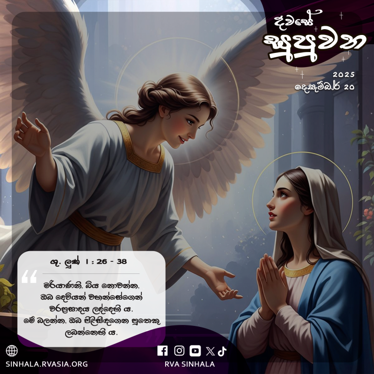 26 සවැනි මස, ගාබ්රියෙල් නම් දේව දූතයා දෙවියන් වහන්සේ විසින් ගලීලයේ නාසරෙත් නම් නුවර විසූ, 27 දාවිත් රජ පරපුරෙන් පැවත එන ජෝසෙප් නම් මනුෂ්යයෙකු හට විවාහ ගිවිසුම් දී සිටි කන්යාවක වෙත යවන ලදී. ඒ කන්යාවගේ නම මරියා ය. 28 දේව දූතයා ඈ සිටි තැනට පැමිණ, ”විපුල ප්රසාදලත් උත්තමිය, ඔබට මංගල වේ; සමිඳාණන් වහන්සේ ඔබ සමඟ ය”යි කී ය. 29 එහෙත්, ඈ ඒ වදන් අසා අතිශයින් කැළඹී මේ කෙබඳු ආචාරයක් දැ යි සිත සිතා සිටියා ය. 30 දේව දූතයා ඈට කතා කොට, ”මරියාණනි, බිය නොවන්න, ඔබ දෙවියන් වහන්සේගෙන් වරප්රසාදය ලද්දෙහි ය. 31 මේ බලන්න, ඔබ පිළිසිඳගෙන පුතෙකු ලබන්නෙහි ය; උන් වහන්සේට ජේසුස් යන නාමය තබන්න.