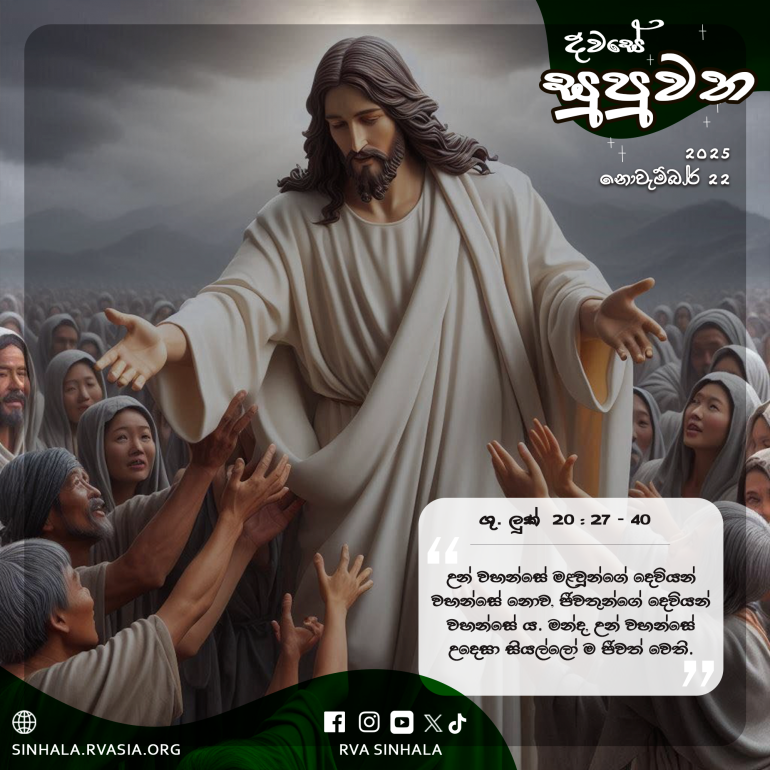 27 පුනරුජ්ජීවනයක් නැතැ යි කියන සද්දුසිවරුන්ගෙන් සමහරෙක් ජේසුස් වහන්සේ වෙත අවුත්, 28 ”ගුරුදේවයෙනි, යම් මිනිසෙකු භාර්යාව ජීවත් ව සිටිය දී දරුපල නොලැබ මළොත්, ඔහුගේ සහෝදරයා ඒ භාර්යාව පාවාගෙන, තම සහෝදරයාගේ නමට දරුවන් ඉපදවිය යුතු යයි මෝසෙස් ලියා ඇත. 29 ඉදින්, සහෝදරයෝ සත් දෙනෙක් සිටියහ. පළමුවැන්නා භාර්යාවක පාවාගෙන දරුපල නොලබා මළේ ය. 30 දෙවැන්නාත් තුන්වැන්නාත් ඇය පාවා ගත්හ. 31 සත් දෙන ම එසේ දරුපල නොලබා මළෝ ය. 32 පසුව ඒ ස්ත්රියත් මළා ය. 33 සත් දෙනාම ඈ පාවාගත් බැවින්, පුනරුජ්ජීවනයේ දී ඈ ඔවුන්ගෙන් කවරකුගේ භාර්යාව වන්නී දැ”යි ඇසූ හ. 34 ජේසුස් වහන්සේ පිළිතුරු දෙමින්, ”මේ යුගයට අයත් වූවෝ ආවාහ විවාහ වන්නාහු ය; 35 එහෙත් එන යුගයට හා පුනරුජ්ජීවනයට පැමිණීමට වරම් ලත් අය ආවාහ වන්නේ වත් විවාහ වන්නේ වත් නැත. 36 ඉන්පසු ඔවුන්ට මරණයක් නැත. ඔව්හු දේව දූතයන්ට සම වෙති. පුනරුජ්ජීවන වරය ලත් බැවින් ඔව්හු දෙවියන් වහන්සේගේ පුත්රයෝ ය. 37 ‘සමිඳාණන් වහන්සේ ආබ්රහම්ගේ දෙවියන් වහන්සේ ය, ඊසාක්ගේ දෙවියන් වහන්සේ ය, ජාකොබ්ගේ දෙවියන් වහන්සේ ය’යි කීමෙන් මෝසෙස් පවා, පුනරුජ්ජීවනයක් ඇති බව පඳුර පිළිබඳ පාඨයෙහි පෙන්වා දී ඇත. 38 උන් වහන්සේ මළවුන්ගේ දෙවියන් වහන්සේ නොව, ජීවතුන්ගේ දෙවියන් වහන්සේ ය. මන්ද, උන් වහන්සේ උදෙසා සියල්ලෝ ම ජීවත් වෙති”යි වදාළ සේක. 39 එවිට විනයධරයන්ගෙන් සමහරෙක් උත්තර දෙමින්, ”ගුරුදේවයෙනි, ඔබේ කතාව කදිම ය”යි කී හ. 40 උන් වහන්සේගෙන් තවත් කිසි ප්රශ්නයක් ඇසීමට ඔවුන්ට ධෛර්ය නොතිබිණි.