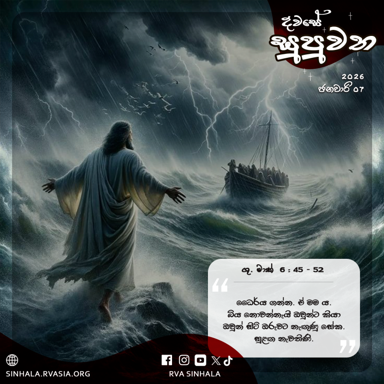 45 එකෙණෙහි ම උන් වහන්සේ සමූහයා විසුරුවා හැරිය සේක. සිය ශ්‍රාවකයන්ට ද ඔරුවට නැඟී තමන්ට පෙරටුව බෙත්සයිදාව බලා එගොඩට යන්න අණ දුන් සේක. 46 උන් වහන්සේ ඔවුන්ගෙන් වෙන් වූ පසු යාච්ඤා කරනු වස් කන්දට නැඟුණු සේක. 47 සවස් වූ කල ඔරුව මුහුද මැද විය. උන් වහන්සේ තනි ව ගොඩ සිටි සේක. 48 සුළඟ ඔවුන්ට විරුද්ධ ව හැමූ බැවින්, ඔවුන් ඔරු පැදීමෙන්‍ වෙහෙසෙනු දුටු උන් වහන්සේ, රෑ සතර වැනි යාමයb පමණේ දී මුහුද පිට ඇවිදිමින් ම ඔවුන් වෙත අවුත් ඔවුන් පසු කර යන්න තැත් කළ සේක. 49 ඔව්හු උන් වහන්සේ මුහුද පිට ඇවිදිනු දැක, ”ඒ අවතාරයකැ”යි සිතා බියෙන් මොරගැසූ හ. 50 සියල්ලෝ ම උන් වහන්සේ දැක බිය වූ හ. එහෙත් උන් වහන්සේ එකෙණෙහි ම, ”ධෛර්ය ගන්න; ඒ මම ය; බිය නොවන්නැ”යි ඔවුන්ට කියා 51 ඔවුන් සිටි ඔරුවට නැඟුණු සේක. සුළඟ නැවතිණි. ඔව්හු විස්මයෙන් විස්මයට පත් වූ හ. 52 ඔවුන්ගේ මනස අඳුරු වී තිබිණි. මක්නිසා ද රොටි පිළිබඳ සිද්ධිය ඔවුන්ට අවබෝධ නොවූ බැවිනි.