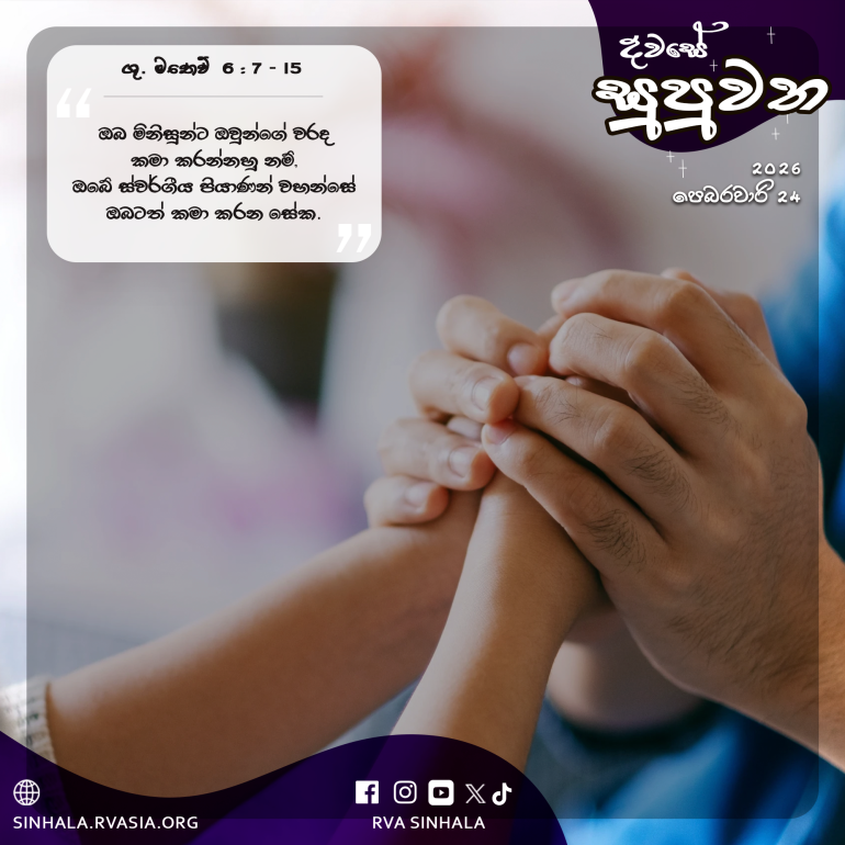 14 ”ඔබ මිනිසුන්ට ඔවුන්ගේ වරද කමා කරන්නහු නම්, ඔබේ ස්වර්ගීය පියාණන් වහන්සේ ඔබටත් කමා කරන සේක. 15 එහෙත්, ඔබ මිනිසුන්ට ඔවුන්ගේ වරදට කමා නොකරන්නහු නම්, පියාණන් වහන්සේ ඔබේ වරදටත් කමා නොකරන සේක.”