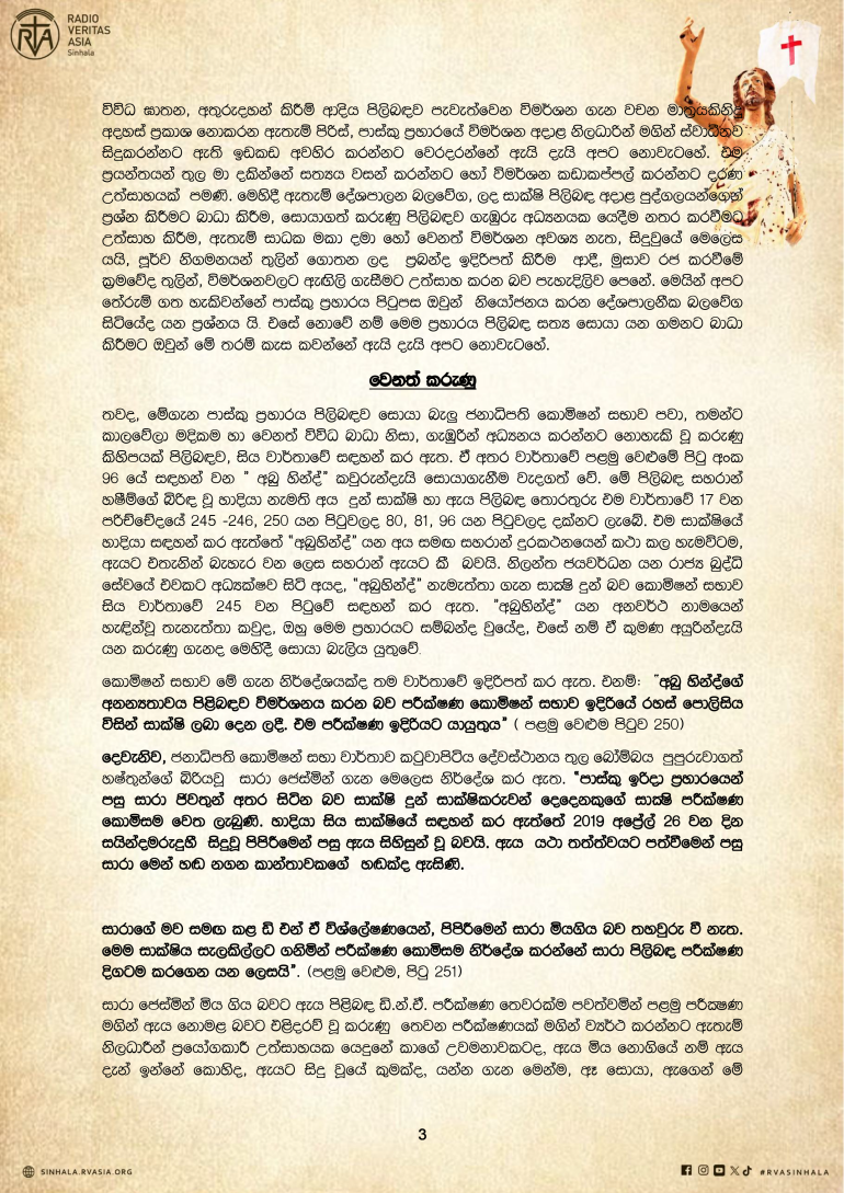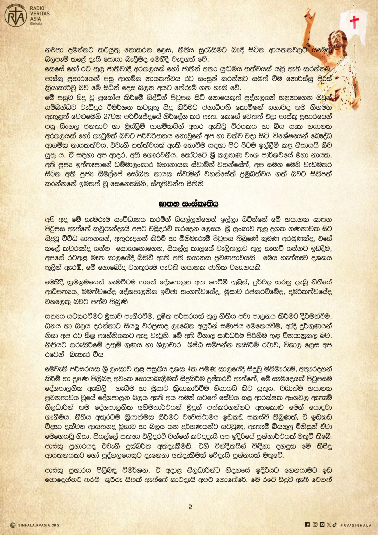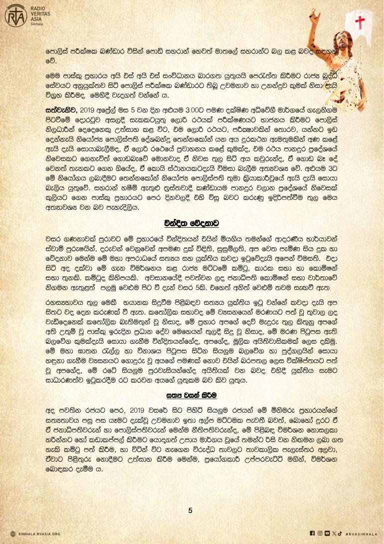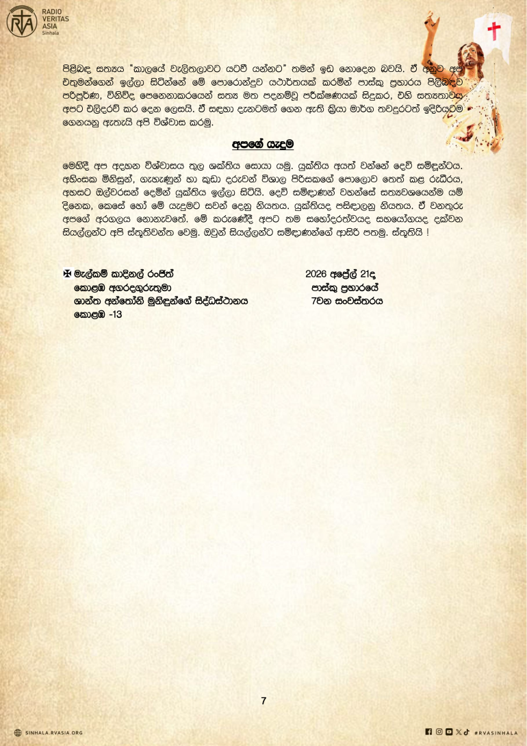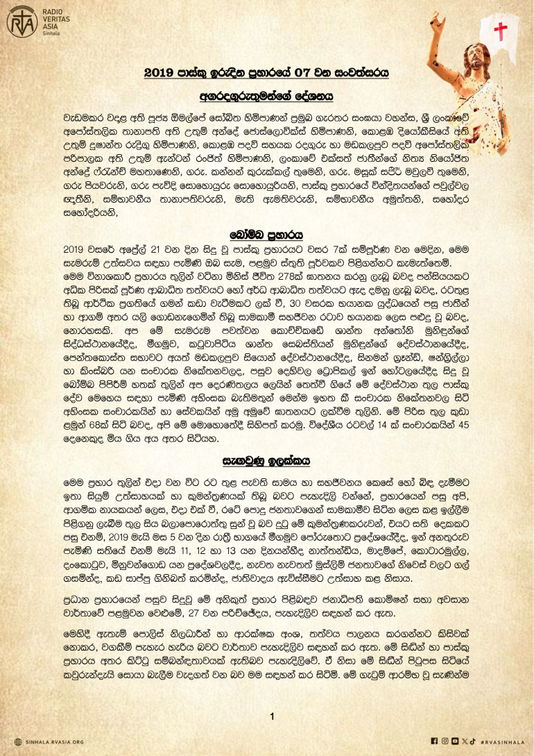 පුවත් සුපුවත් පාස්කු ඉරුදින ප්රහාරයේ 07 වන සංවත්සරයේ දී අගරදගුරුතුමන්ගේ සම්පූර්ණ දේශනය By Sinhala Service, 21 April, 2026 පාස්කු ඉරුදින ප්රහාරයේ 07 වන සංවත්සරයේ දී අගරදගුරුතුමන්ගේ සම්පූර්ණ දේශනය Your name Comment Subscribe Get awesome content in your inbox. Email Address First Name Last Name More පුවත් සුපුවත් පුවත් සුපුවත් හිස් දෙපතුළින් සේවයේ යෙදෙන වෛද්යවරුන් බිහි කළ දේව සේවිකාව පුවත් සුපුවත් ස්වර්ගස්ථ ආචාර්ය ගරු කැමිලස් ප්රනාන්දු පියතුමා සමාදානයේ සැතපේවා! පුවත් සුපුවත් වෙරිටාස් වෙත ආ සාන්තුවරු තිදෙනා