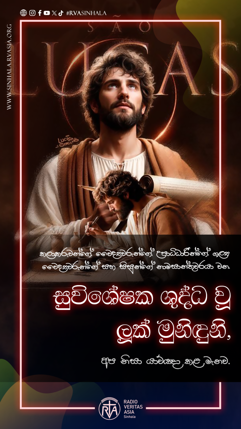කලාකරුවන්ගේ, වෛද්යවරුන්ගේ, උපාධිධාරීන්ගේ, ශල්ය වෛද්යවරුන්ගේ සහ සිසුන්ගේ නාමසාන්තුවරයා වන, සුවිශේෂක ශුද්ධ වූ ලූක් මුනිඳුනි, අප නිසා යාච්ඤා කළ මැනව.