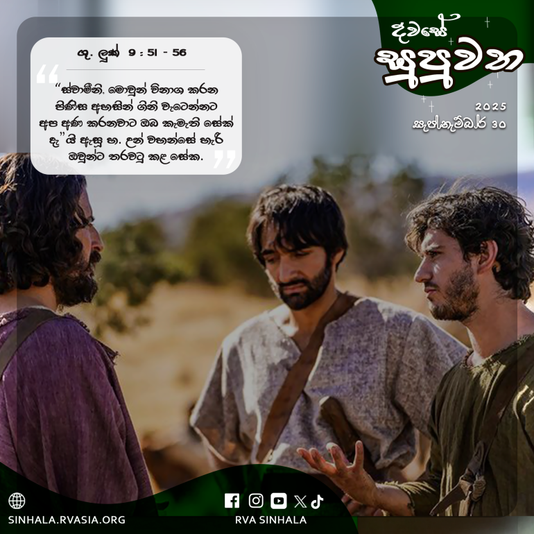 51 තවද, උන් වහන්සේගේ ස්වර්ගාරෝහණ දිනය ආසන්න වූ කල, උන් වහන්සේ ජෙරුසලම බලා යන අධිෂ්ඨානයෙන් 52 තමන්ට පෙරටුව දූතයන් යැවූ සේක. ඔව්හු ගොස් උන් වහන්සේට අවශ්ය දේ පිළියෙළ කරන පිණිස සමාරීයයන්ගේ ගමකට ඇතුළු වූ හ. 53 එහෙත්, උන් වහන්සේ හුදෙක් ජෙරුසලමට ම යන්නට අදහස් කර සිටි බැවින් ඔව්හු උන් වහන්සේ නොපිළිගත්හ. 54 උන් වහන්සේගේ ශ්රාවකයන් වූ ජාකොබ් ද ජොහන් ද ඒ දැක, ”ස්වාමීනි, මොවුන් විනාශ කරන පිණිස අහසින් ගිනි වැටෙන්නට අප අණ කරනවාට ඔබ කැමැති සේක් දැ”යි ඇසූ හ. 55 උන් වහන්සේ හැරී ඔවුන්ට තරවටු කළ සේක. 56 ඉන්පසු ඔව්හු අන් ගමකට ගියහ.