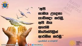 සසුන් පිය සටහන් සසුන් පිය සටහන් 2024 ජනවාරි 18 “සමහර වෙලාවට අපි කළ යුතු දේ අපි දන්නා නමුත් එය කිරීමට අපට ධෛර්යයක් නැත. ස්වාමින් වහන්සේ කෙරෙහි විශ්වාසය තබමින් තීරණ ගන්නා ආකාරය අපි මරියතුමියගෙන් ඉගෙන ගනිමු.” -ෆ්රැන්සිස් පාප්තුමන්